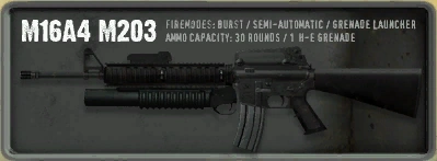 The M203 can only be attached to the M16A4 and M4A1 assault rifles. The launcher's 40mm Grenades must reach a minimum arming distance before they will detonate upon impact. The M203 can be selected by selecting the primary weapon after it has already been selected. This is 1 as a default or middle-click.
