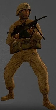 The Security support class wears a MICH 2000 helmet with a balaclava and tactical goggles on his head. He wears a Modular Tactical Vest (MTV) on his torso and a backpack. They are the only class with access to the M249.